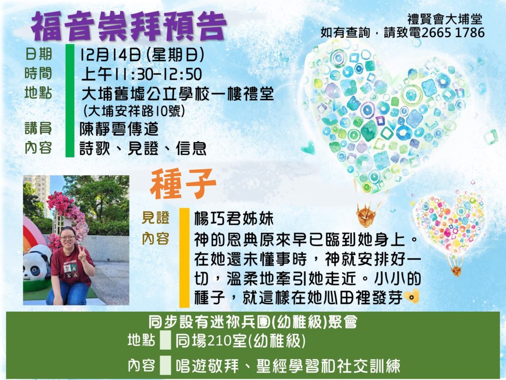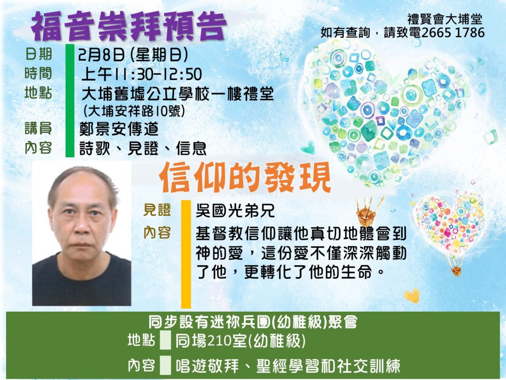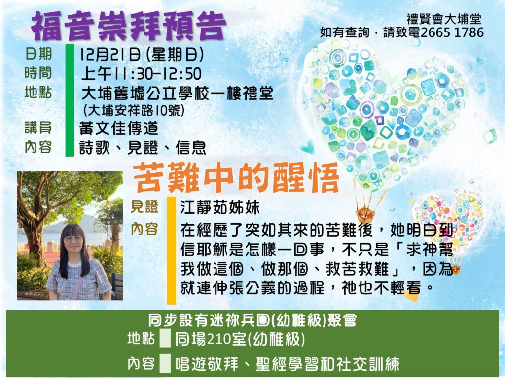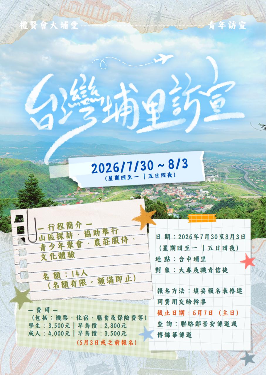 本堂歷史可追溯至1954年,當年的禮賢會香港區會有意在元朗、上水、粉嶺、大埔一帶發展聖工,最後在大埔舊墟汀角路興建教會......