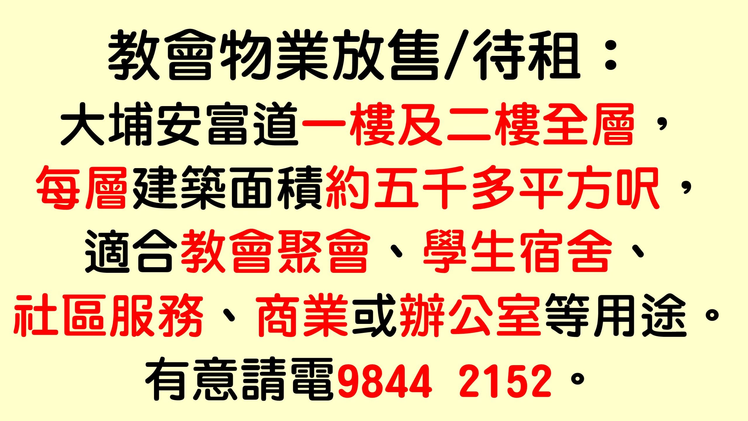 教會物業放售/待租:大埔安富道一樓及二樓全層,每層建築面積約五千多平方呎,適合教會聚會、學生宿舍、社區服務、商業或辦公室等用途。有意請電9844 2152。